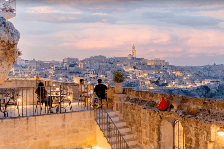 Continue to the spellbinding city of Matera, one of the world’s oldest continuously inhabited settlements. Check in at Hotel Il Belvedere, perched above the ancient Sassi cave dwellings, with sweeping rooftop views that are especially magical at sunset.